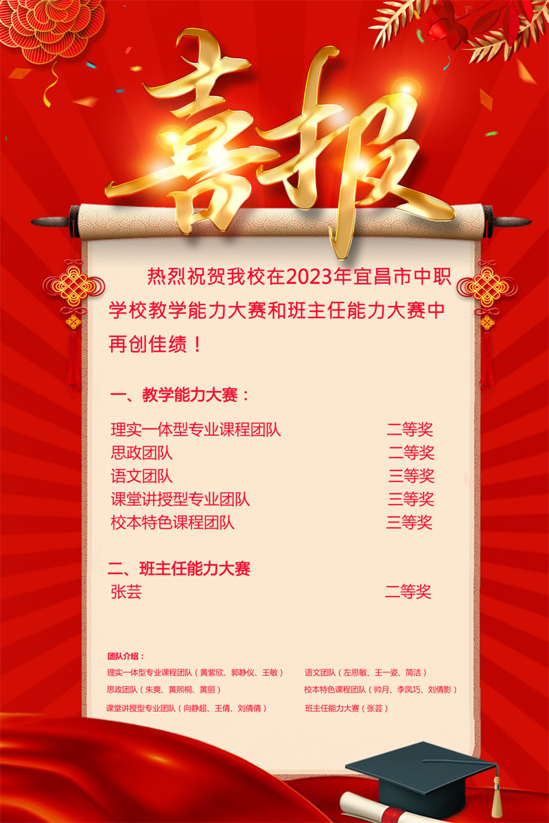 6月16日,宜昌市中职学校教学能力大赛和班主任大赛圆满落幕,我校获得三个二等奖、三个三等奖的好成绩,获奖率全市居首。本次参赛···