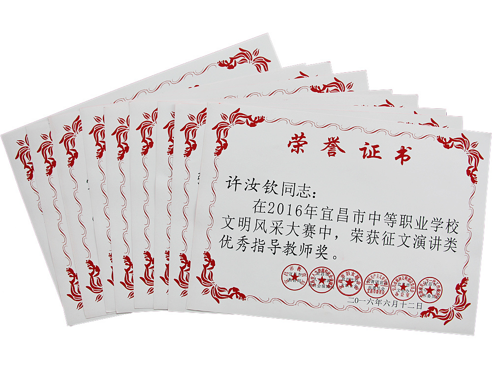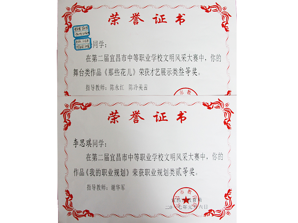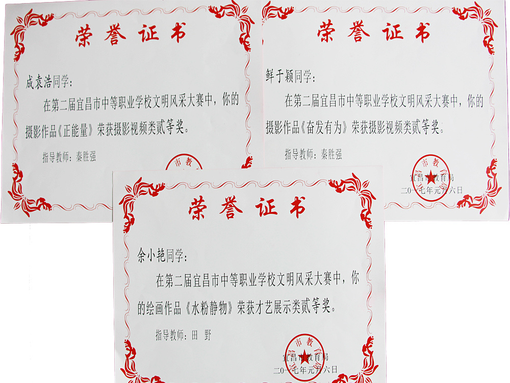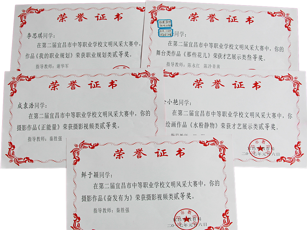学生在第二届宜昌中职学校文明风采大赛荣获荣誉证书