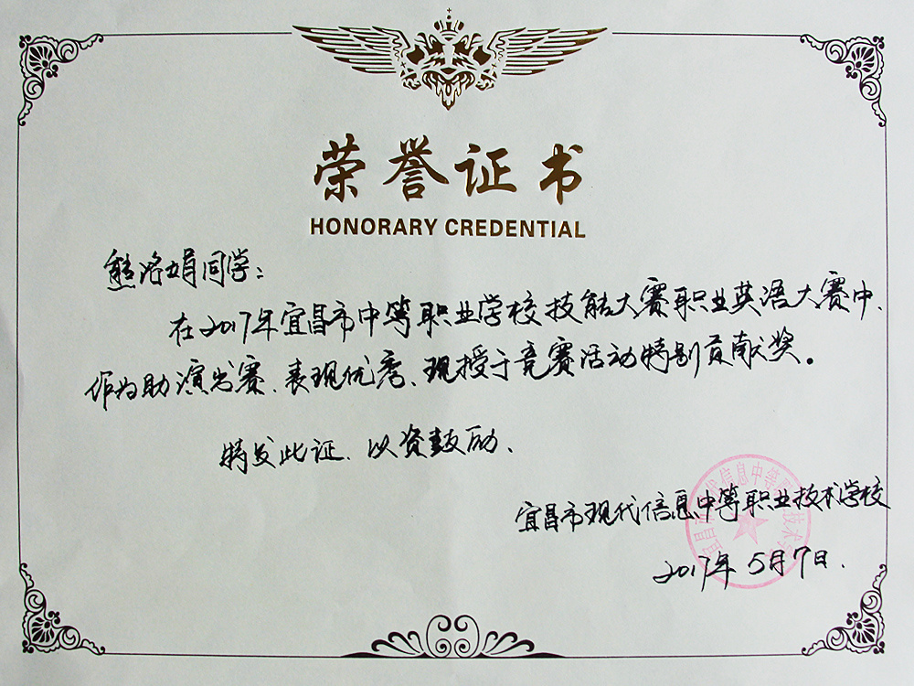 同学在2017年宜昌中职学校技能大赛中荣获特别贡献奖