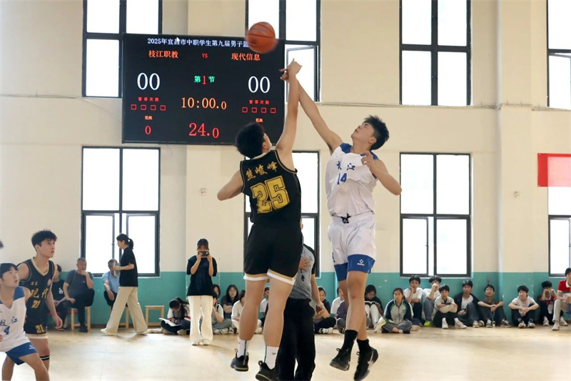 —篮球联赛半决赛 —5月16日,宜昌市第九届中职学生男子篮球联赛第五日,半决赛现场,比赛进入白热化阶段,现代信息学校与枝江职···