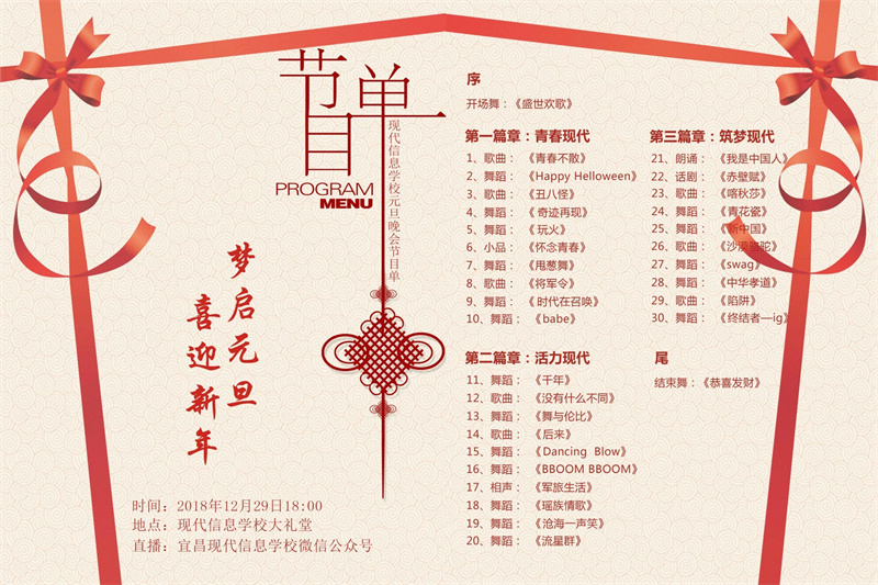整个晚会分三个篇章进行,“青春现代 活力现代 筑梦现代” ,在晚会中间我们还有微信红包摇一摇、现场抽奖等活动,精彩的校园生活,精彩的年度盛典,精彩的元旦晚会,只缺一个同样精彩的你!