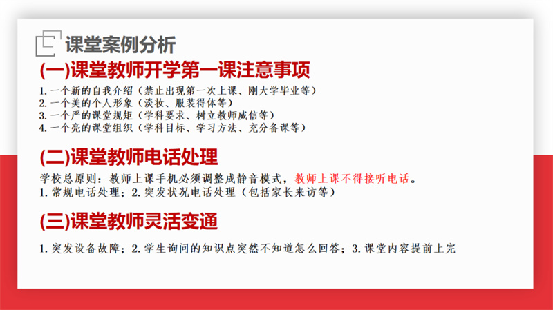 “知不足而奋进,望远山而前行”,为了提升新教师的班级管理能力,使新教师明确现代信息学校教学工作常规要求,营造规范有序的教学环境,课程发展处主任谢华军开展了以“学生课堂管理案例分析及学习”为主题的专题讲座,对课堂常见问题、日常规范、课堂管理进行了详细解读。