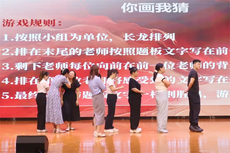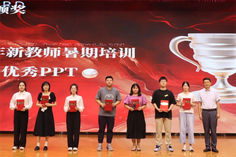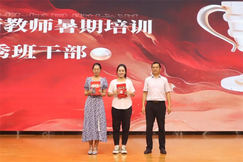 培训结束后,全体新入职教师参加结业典礼,典礼由工会主席张巧巧主持,现代教育集团董事长田水荣、校长吴昌钧、德育校长李朝晖、教学副校长伍远明出席,为新教师带去了关怀问候。