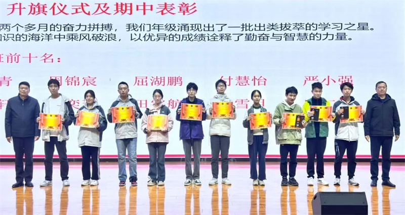 雄壮的国歌声激励着每一位学子不忘初心,砥砺前行。在表彰环节,毕常青、周锦宸、屈湖鹏等优秀学生代表上台领奖,吴昌钧和伍远明为获奖学生颁奖,并鼓励他们继续保持这份热情与努力,为高考冲刺做好充分准备。