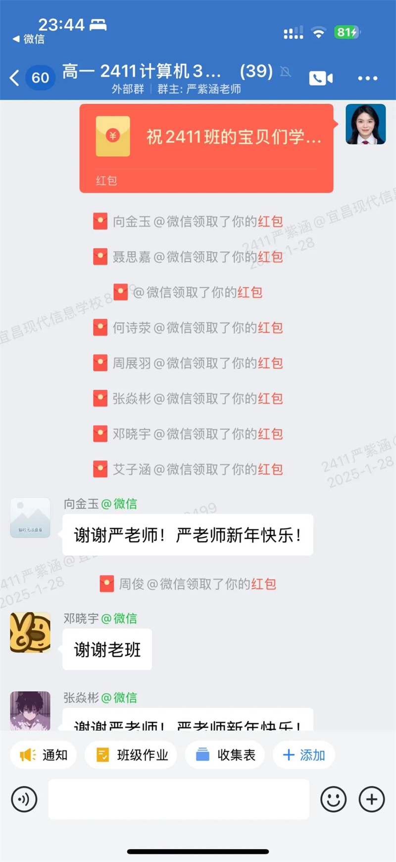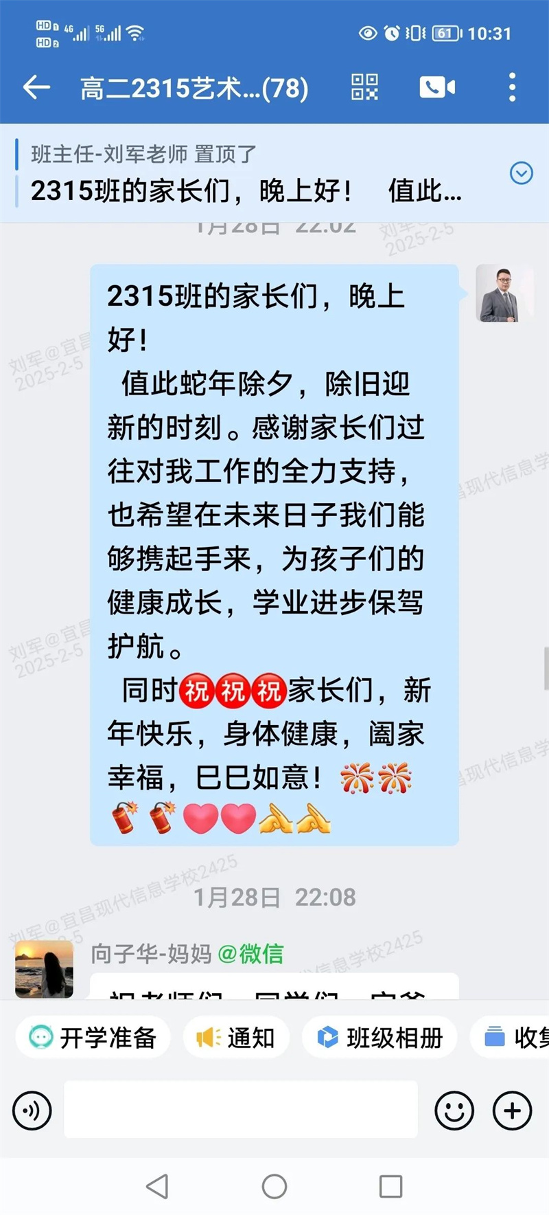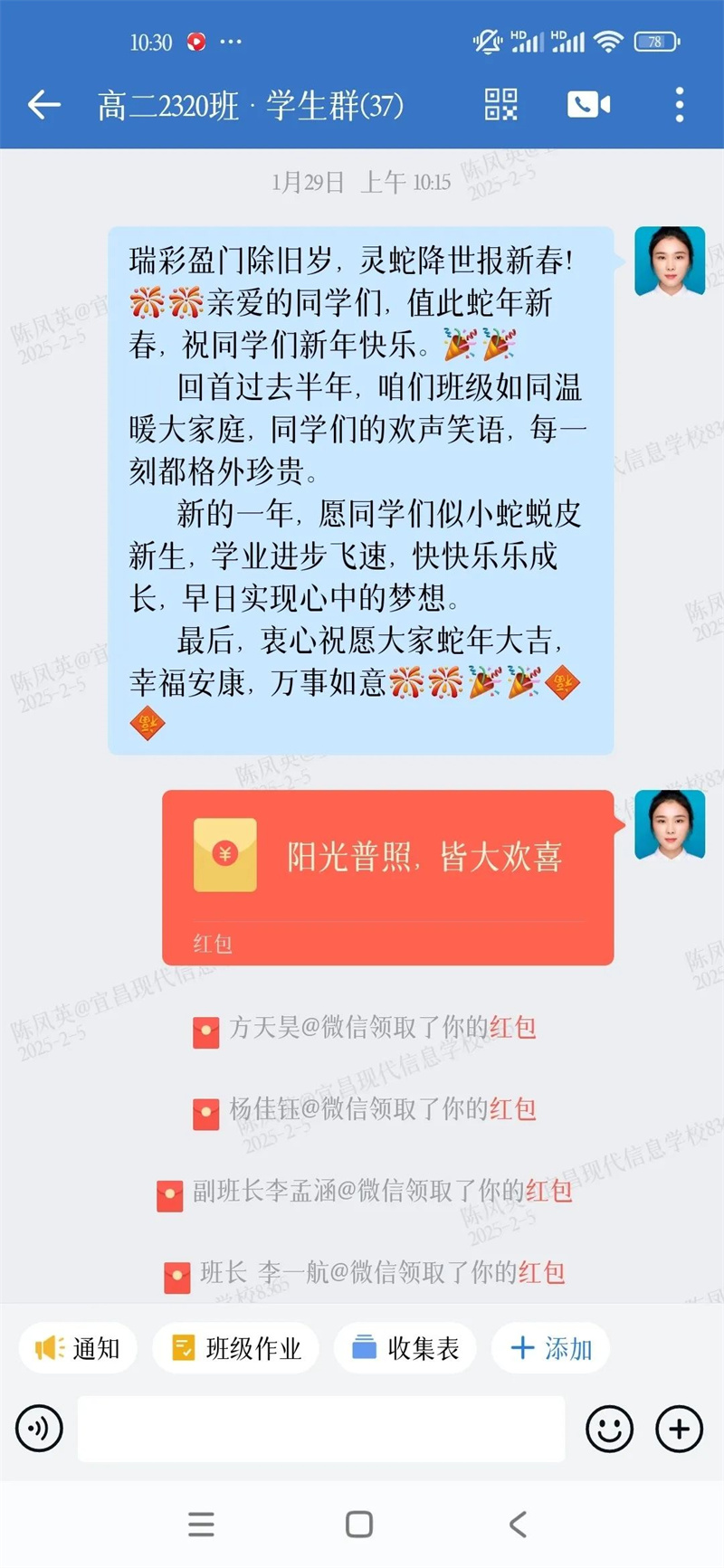 日月其迈,时盛岁新;寒辞冬雪,新元肇始。新年的欢乐还在耳畔回响,春风已吹响新学期的号角,为了解和掌握学生寒假学习生活状态,做好寒假学习生活指导,宜昌市现代信息学校的师生在新春佳节之际多次相聚云端,共话寒假生活。