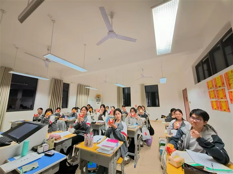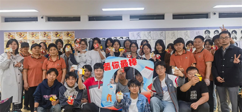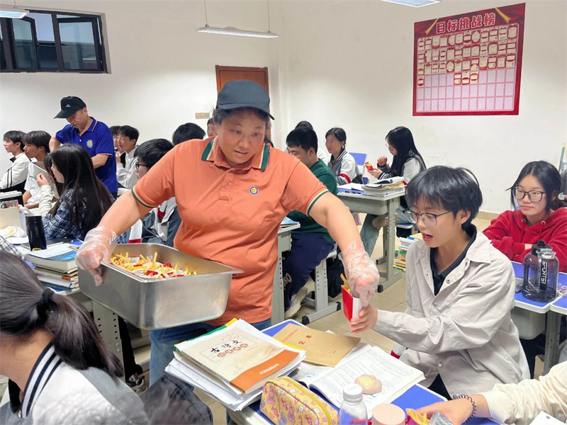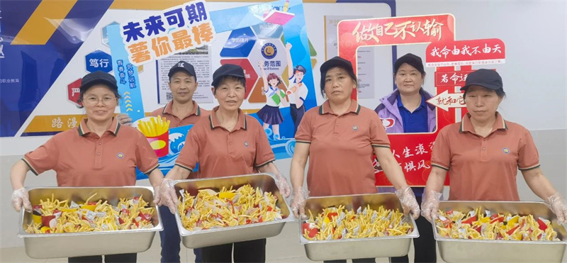 活动当天,后勤保障部员工统一着装,带着真挚的祝福,走进各个教室。他们将搭配好番茄酱的薯条送到同学们手中,“同学们,梦想不会发光,发光的是追逐梦想的你。‘青春因磨砺而出彩,人生因奋斗而升华’,愿你们在考试中乘风破浪,金榜题名!”这些温暖有力的话语,在教室里回荡,也深深刻在同学们心间。