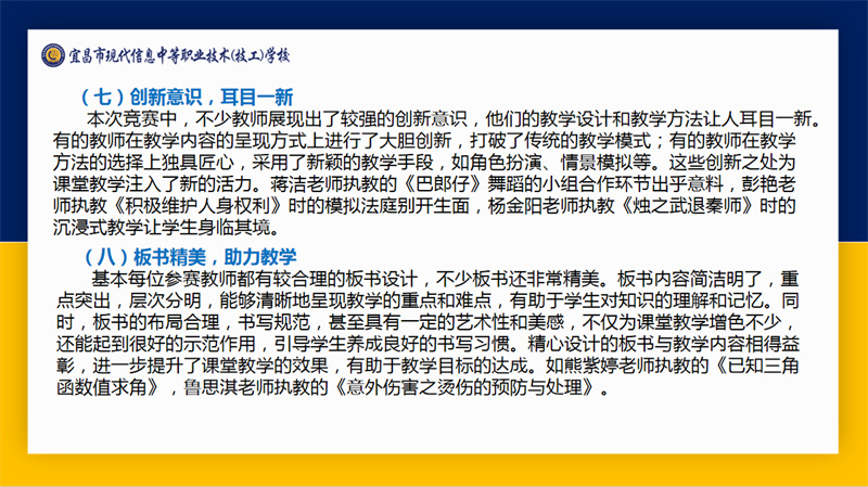 伍远明以“赛课展风采,磨砺见成长”为题,从“精心设计,环节完整”“用心导入,激发求知欲”“联系实际,融合专业”等十个角度对“生动课堂”教学大赛呈现的亮点进行了点评。同时,他也从“取舍更精、挖掘更深”“设计更优,提问更准”等三个方面提出了优化建议。他的深度分析覆盖到了每一位参赛教师的课堂,指导所有教师握稳课堂设计的“指挥棒”,用好多元评价的“计分牌”,树好激励引导的“导向标”。