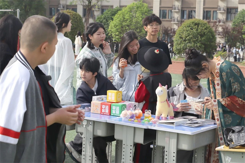 创意跳蚤市场热闹非凡,各个摊位前人头攒动。同学们纷纷拿出自己的手工艺品、书籍、饰品等进行售卖或交换,摊位布置各具特色,充满创意。精美的手绘书签、独特的手工饰品、可爱的多肉植物等商品琳琅满目,叫卖声、欢笑声此起彼伏,不仅锻炼了同学们的沟通和理财能力,还增进了彼此间的交流与友谊。