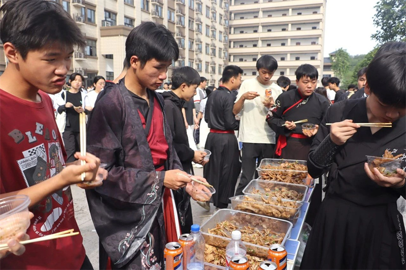 舌尖盛宴区域香气四溢,令人垂涎欲滴。后勤保障部精心准备了宜昌本地特色小吃及中式传统点心,搭配古风餐具与摊位布置。红亮诱人的麻辣小龙虾、清爽筋道的秘制凉面、金黄酥脆的现炸薯条、酱香浓郁的虎皮卤蛋等美食,让师生们大快朵颐。大家一边品尝风味各异的佳肴,一边交流活动感受,现场氛围温馨而热烈,美食的烟火气与欢声笑语交织成独特的初夏记忆。
