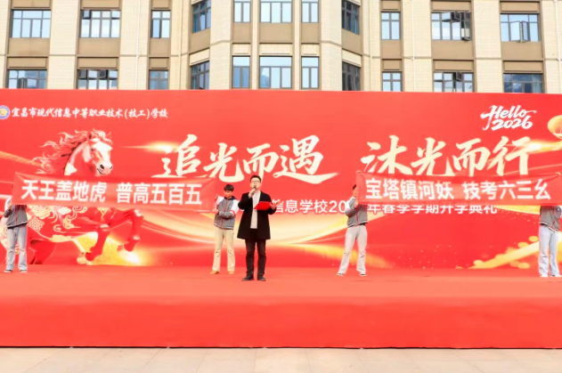 春潮涌动启新章,桃李芬芳向未来。3月6日,宜昌现代信息学校全体师生齐聚校园,隆重举行2026年春季开学典礼,共同开启新学期的逐梦征程。宜昌现代教育集团董事长、党支部书记田水荣,集团总经理胡一杰,集团董事朱爽,现代信息学校党支部副书记、校长吴昌钧,督学李朝晖,副校长肖飞及各处室主任出席本次典礼。典礼由教师汪煜韩与学生黄梦娇联袂主持。