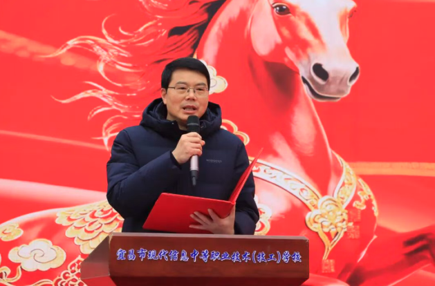吴昌钧校长为开学典礼作致辞,他向全体师生致以新学期的美好祝愿,对过去一学期学校取得的成绩予以肯定。同时,紧扣职业教育发展趋势,以马年春晚节目为引,结合世赛冠军、科技节目等案例,激励学子正视成长挫折,深耕技能、坚守匠心,做“驭风骏马”,勉励全体学子以技能为翼、以初心为炬,在职业教育的广阔舞台上绽放光彩。
