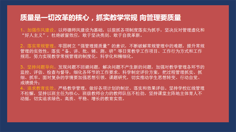 执行校长李朝晖从学校安全管理、课堂及活动质量、教师学习意识、教职员工服务意识、各部门工作成效、年级组管理落实、学生认可度、后勤服务质量等十方面对上半学期工作做了全面总结,对下阶段工作提出了增强规则意识、提高课堂参与度、提高责任担当等要求,希望老师们立足当下,立足岗位,将工作做优、做精、做实、做深。