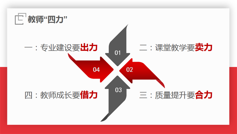 课程发展处主任谢华军就期中考试成绩做了分析总结,并提出教师应具备的“四力”,专业建设要出力、教学要卖力、提升质量要合力、教师成长要借力。通过成绩分析表,对校内班班比、教师比、学生比的预警机制做出阐释,明确了在教学中不断调整策略、多讲配合、多讲方法的重要性。
