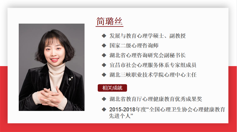 “想让一片土地不荒芜,保持生机,好的办法不是每天去清除杂草,欲无杂草,先种庄稼”,学生成长过程中,教师是重要的支持和引导力量,是学生心理健康发展的有力保障。为加强全体教职员工心理危机预防、识别与干预务实能力,进一步推进学校心理健康教育工作,掌握科学的心理辅导方法,增强全员育人的意识,8月23日,我们特别邀请湖北三峡职业技术学院心理中心主任简璐丝,开展了以“用成熟的智慧,回应混乱的青春”为主题的学生心理健康培训。