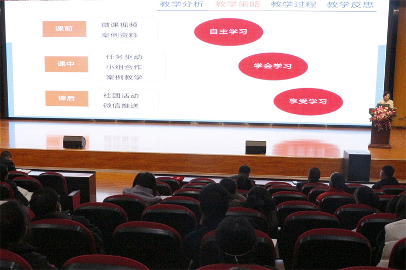 钟林还分享了自己和比赛一起成长的经验,在大赛中找差距,在大赛中不断成长。并演示了自己获得湖北省教学能力大赛一等奖的作品,让老师们感受到了自身的差距,也深切体会到了学习的必要性,钟林感悟:“让学习成为一种信仰,以比赛促进个人成长。”