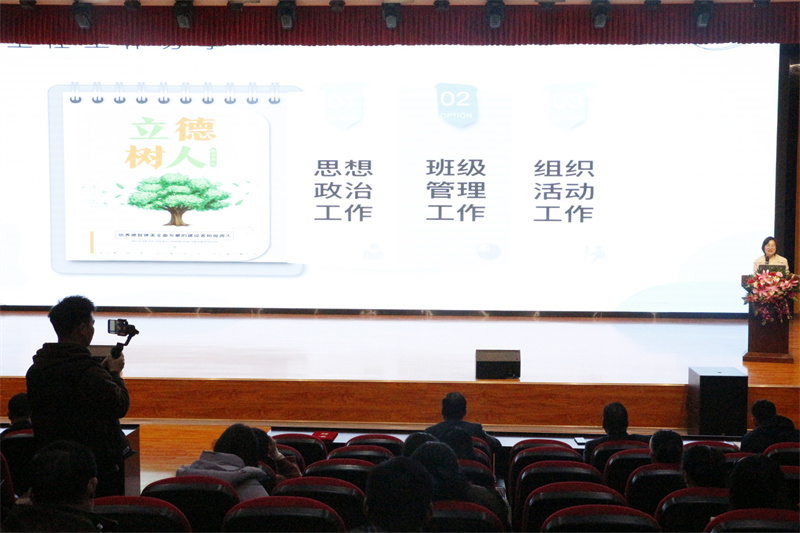 钟林总结了自己多年的的班主任工作经验,并做了有理有据的具有很强指导意义的分享。她指出:“要正确认识我们的学生,落实立德树人,坚持以德育为首的班级管理模式”,她还强调:“我们现在的教法就是将来学生的学法”,“无论班主任还是科任老师,要做好学生的大先生,做好学生的引路人。”
