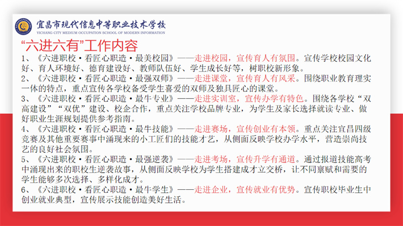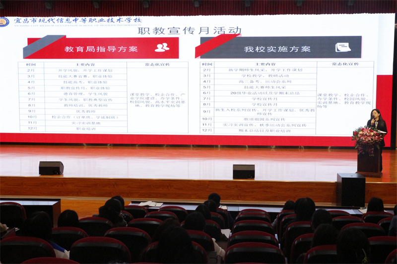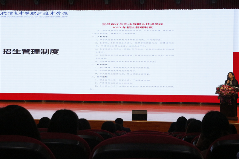 招就处主任杜胜男从2022情况、2023年安排、如何做好全员参与工作三方面解读今年的工作方案。并强调宣传工作是今年宜昌市职教室的三大重点工作之一,呼吁全体教师积极响应教育局号召,参与职教宣传,向社会树立职教新形象,展示职教师生的风采。