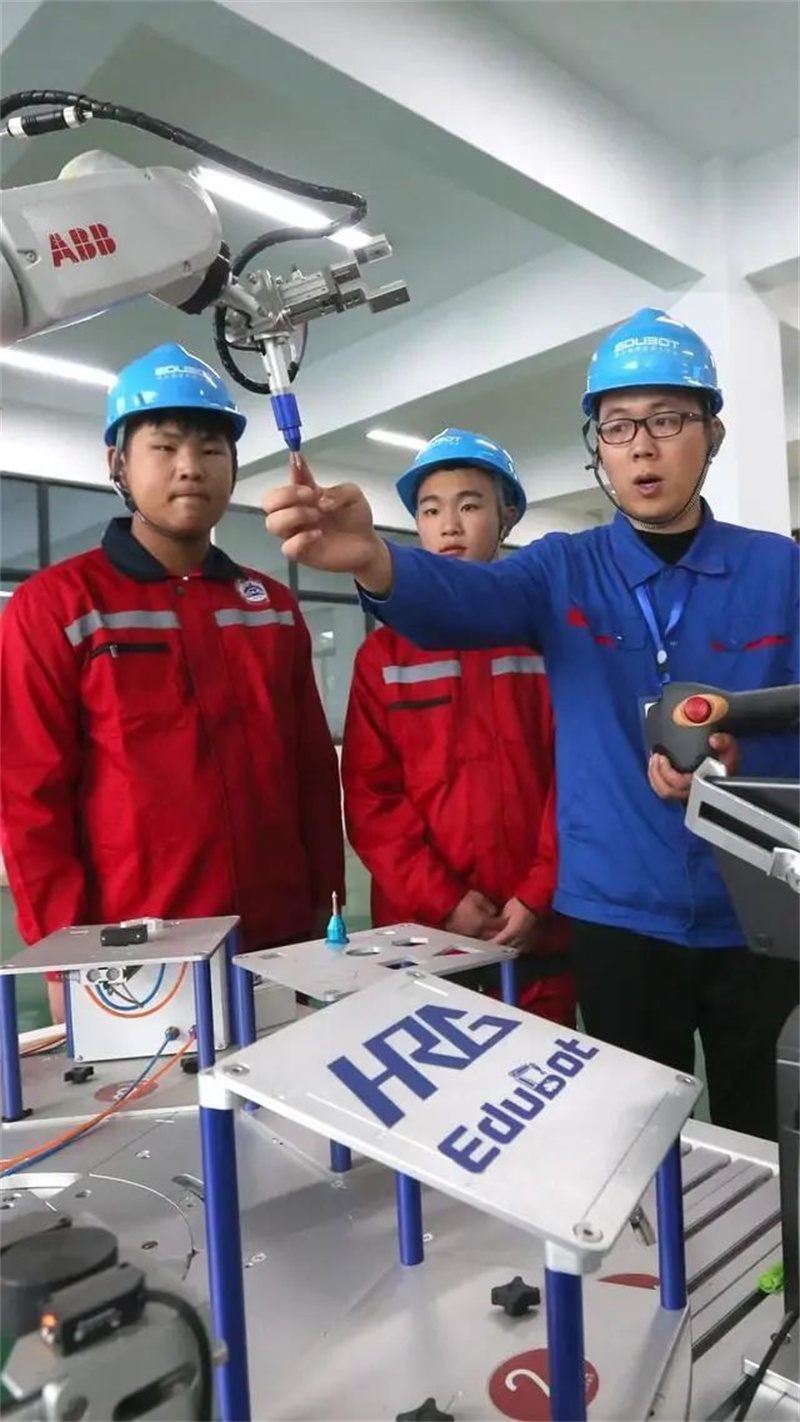 四川省眉山工程技师学院教师指导学生进行工业机器人实操训练