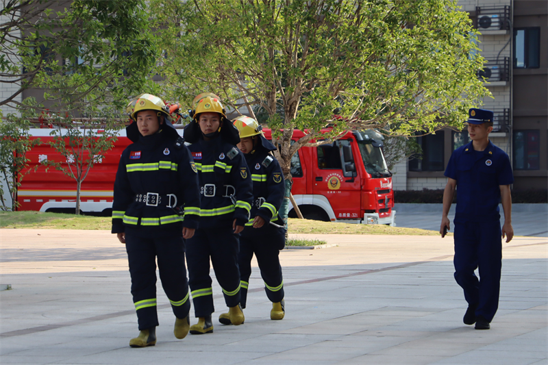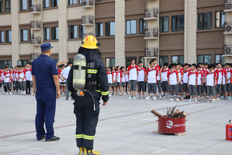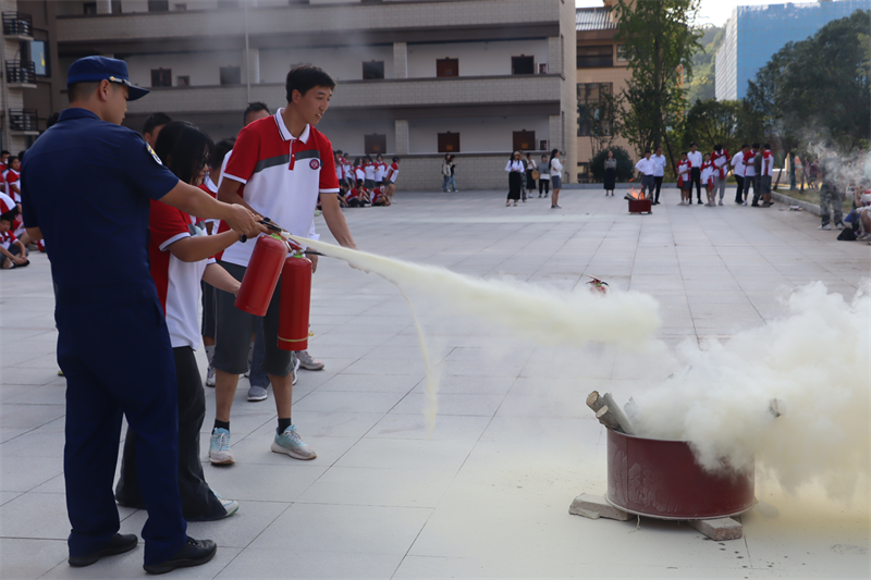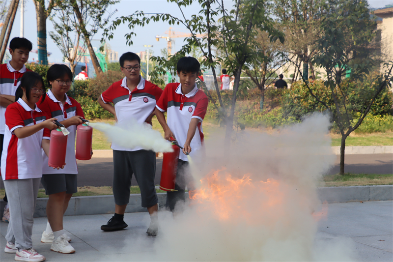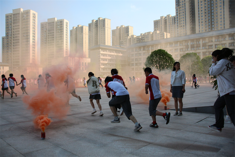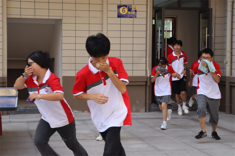 刺耳的警报打破了校园的宁静。教学楼楼梯间浓烟滚滚。各班级按要求从不同楼层撤出,前往指定地点完成疏散。“掩住口鼻、弯腰前行、注意脚下、有序小跑”,一句句坚定有力的口令指导着学生,在教师与教官的引导下,同学们捂住口鼻,有序而快速地撤出楼道。
