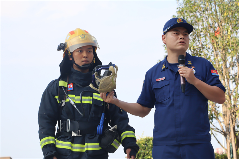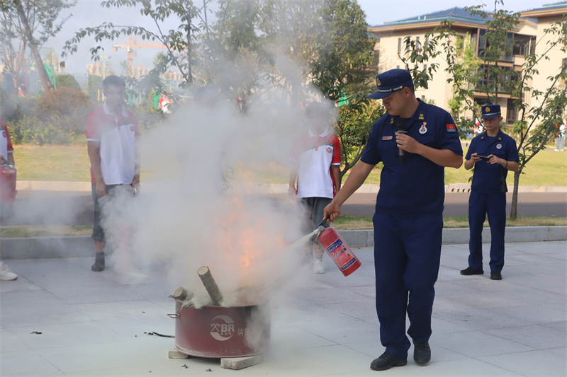 随后,伍家岗应急消防中队的消防员就灭火器的正确使用方法、消防服饰的穿戴、灭火救援过程中的注意事项以及遇到火情时的应急方法为师生进行了细致、全面的讲解。