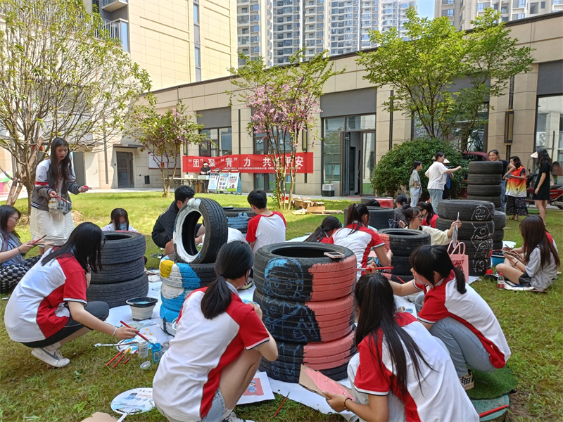 夏日如火,一如大家的热情。学生和志愿者们相互配合,构图、描边、调色、涂色、丰富细节,不断完善。经过多个小时的创作,一幅幅关于禁毒、反电诈、垃圾分类等元素的彩绘画跃然眼前,引得居民纷纷拍照留念。“平时感觉没用处的废旧轮胎,在学生们的画笔下变成了一幅幅生动的画,真是太棒了!”围观的姜阿姨竖起大拇指赞叹。