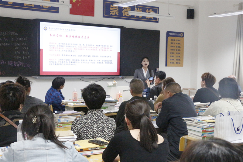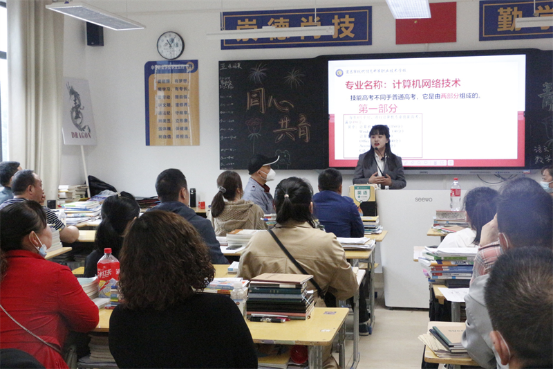 大会后,副校长肖飞作高二年级工作汇报。肖校长立足高考要求和学校发展总体目标从“职教政策”“学生风采”“前期工作总结”“家校联手”四个方面进行阐述,并承诺学校全体教师将用自己的行动践行学校办学愿景:“办为每个学生着想、对每个家庭负责、办党放心、社会满意的职业教育。”