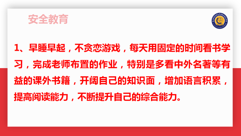 百善文明为先,万思安全重。安全是假期的重中之重。针对暑假安全问题,学生发展处向华主任重点强调假期在交通安全、防火防电、电信诈骗、饮食卫生等方面要注意的问题。学生要时刻加强安全意识,努力增强自我防范能力,做到警钟常鸣,安全永记心间,后祝愿每一位同学都快快乐乐度假,平平安安返校。
