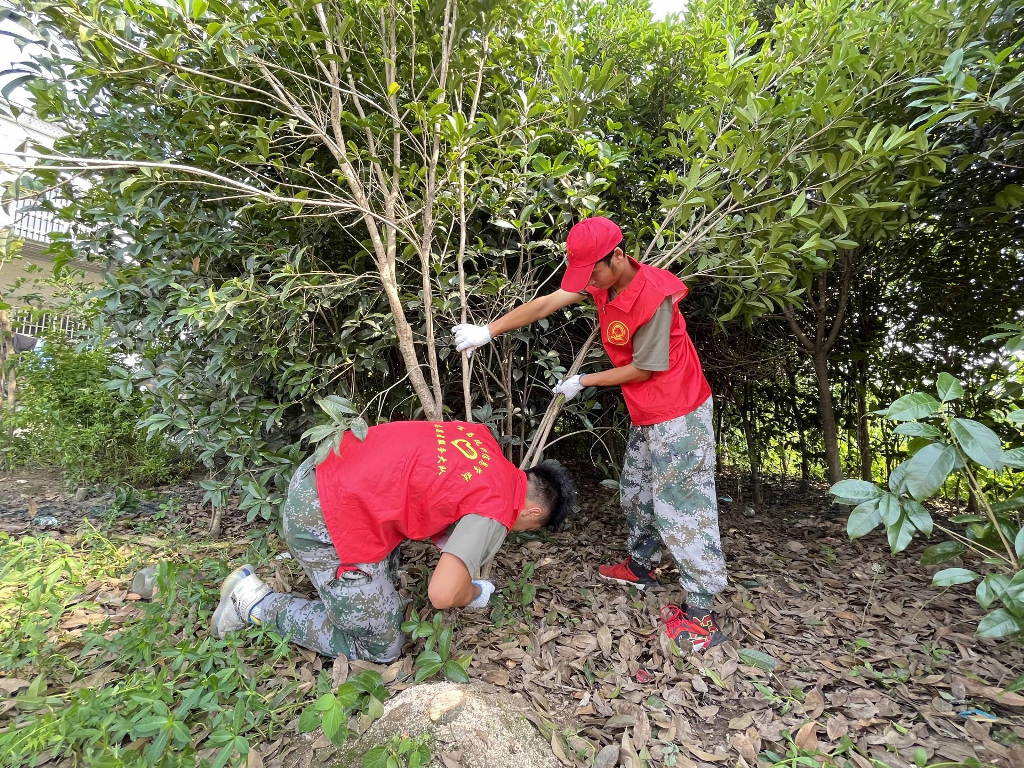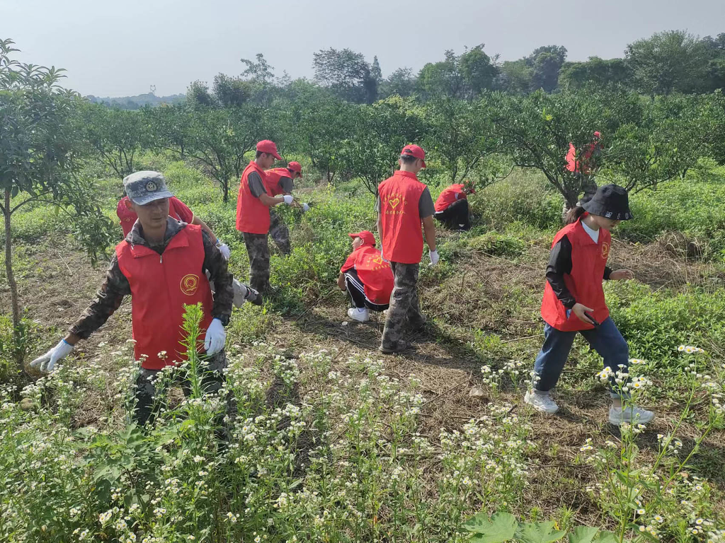 段超老师负责带领男同学清理杂树,席祖萍老师带领部分女生收拾整理房屋及四周的卫生工作,陈喆老师带领部分学生清理田间柑橘树下交错纵横的杂草,疏通水渠,通过一整天的辛勤劳作还田园一派亮丽风景。