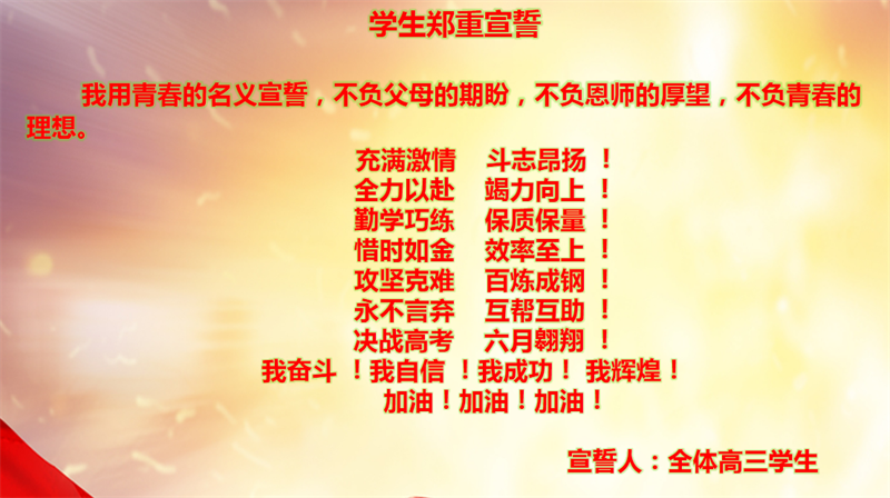 大会尾声,执行校长李朝晖以“拼”“进”“胜”三字作结——拼搏百日,全力奔跑,扎实苦练,点点进步,决胜高考,不负期待。希望未来百日里全体师生勠力同心,铸就高考新辉煌,谱写现代新篇章!