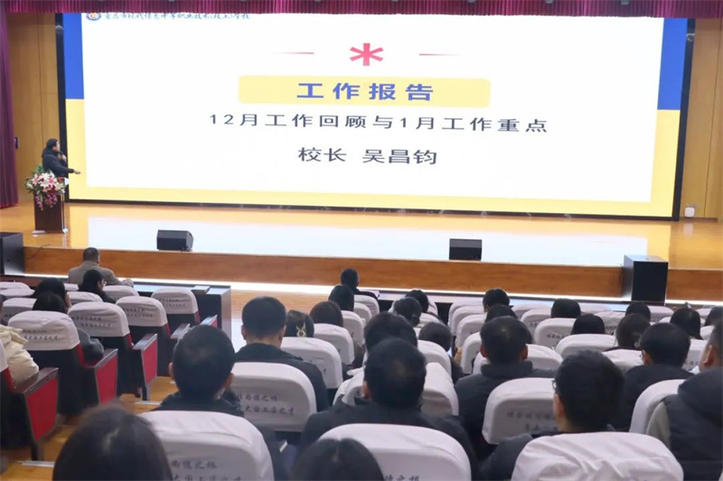 回望是一种姿态,总结过去、反思成长,寒风虽劲却难掩教育的满腔热忱。为了增强教职工凝聚力,推动学校各项工作高效、有序开展,促进教育教学的高质量发展,1月3日下午,学校召开2025年首次教师大会,现代教育集团副董事长朱宗桥、校长吴昌钧、督学李朝晖、副校长肖飞、副校长伍远明、后勤保障部副部长龚红艳出席本次会议,学校全体教职工参加会议。