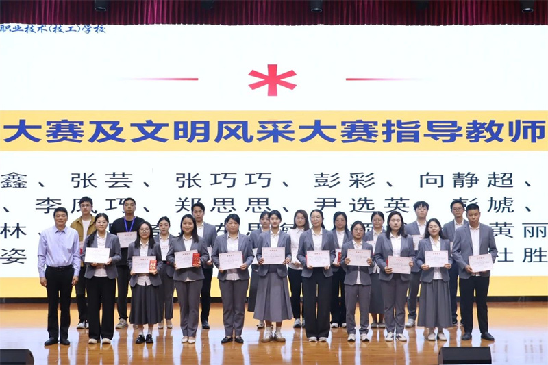 匠心雕琢千钧巧,巧手裁云万象彰。吴昌钧为学生技能大赛及文明风采大赛指导教师颁奖。优异成绩的取得既是师生们辛勤付出的结晶,也是学校教育教学成果的生动体现。学校不断深化“赛教融合”育人机制,构建“以赛促融、以赛促教、以赛促学”的良好生态,为社会培养“既会干,又会说,更能创新”的技术技能型人才,为区域经济高质量发展提供强有力的支撑。