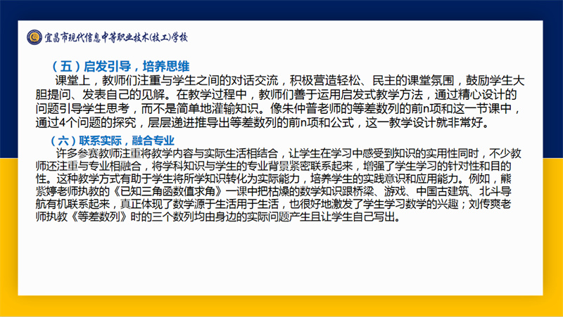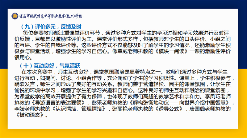 伍远明以“赛课展风采,磨砺见成长”为题,从“精心设计,环节完整”“用心导入,激发求知欲”“联系实际,融合专业”等十个角度对“生动课堂”教学大赛呈现的亮点进行了点评。同时,他也从“取舍更精、挖掘更深”“设计更优,提问更准”等三个方面提出了优化建议。他的深度分析覆盖到了每一位参赛教师的课堂,指导所有教师握稳课堂设计的“指挥棒”,用好多元评价的“计分牌”,树好激励引导的“导向标”。