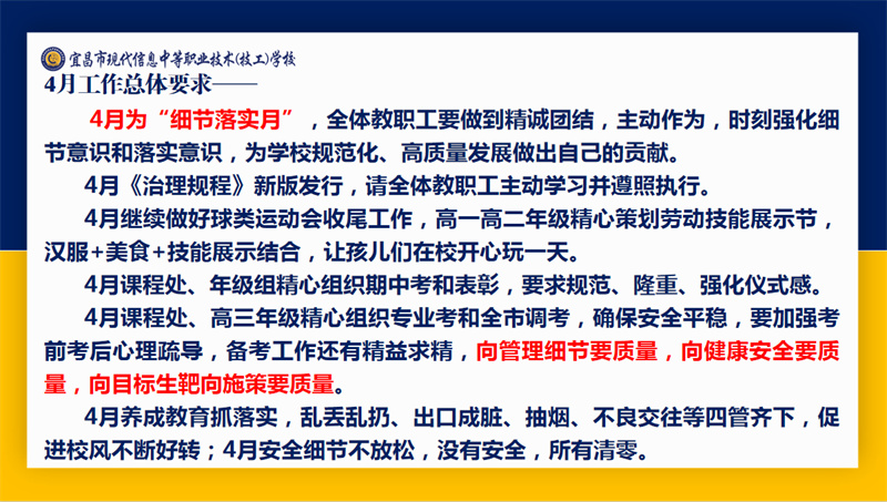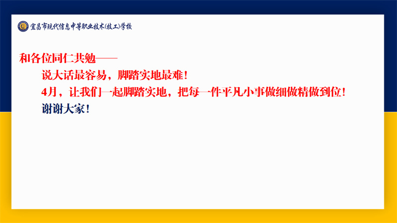 吴昌钧以“精益求精,做好每个服务细节”为主题,高度赞扬3月份职业体验节目出彩、生动课堂亮点纷呈、球类竞赛组织有序、学生管理成效显著、高三调考稳中有进,并对4月整体工作提出要求,希望全体教职工心无旁骛厚植“里子”,勇于担当甘做“实绩”,踏实落实,责任在肩。