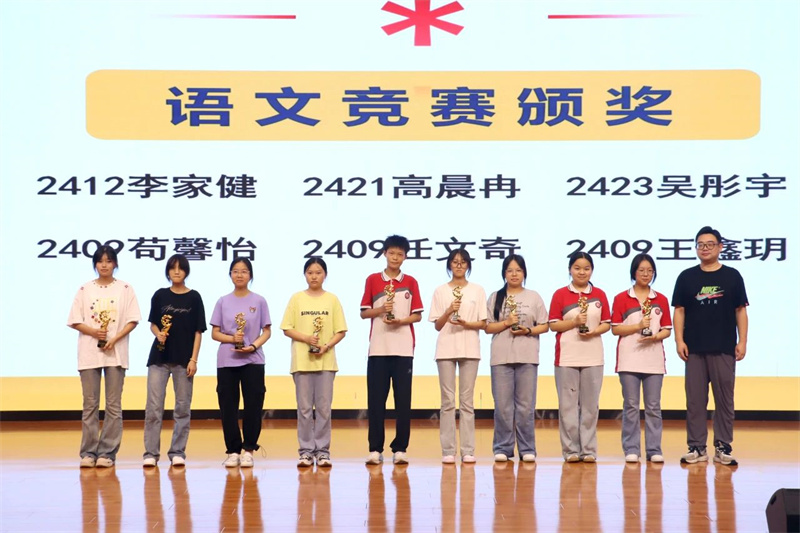 大会伊始,首先进行了高一年级语文学科活动竞赛的颁奖仪式。在热烈的掌声中,十位在本次竞赛中表现突出、成绩优异的同学依次领奖,由高一年级主任邹建以及语文老师范甜甜、温心为他们颁奖。他们以扎实的语文功底、活跃的思维和出色的表现,展现了高一年级学子良好的学科素养和精神风貌。此次颁奖不仅是对获奖同学的肯定,也激励着全体同学在语文学习的道路上不断探索、追求卓越。