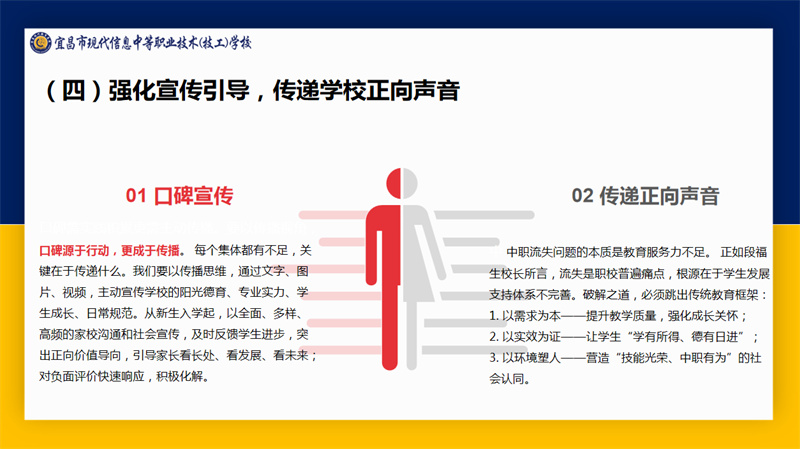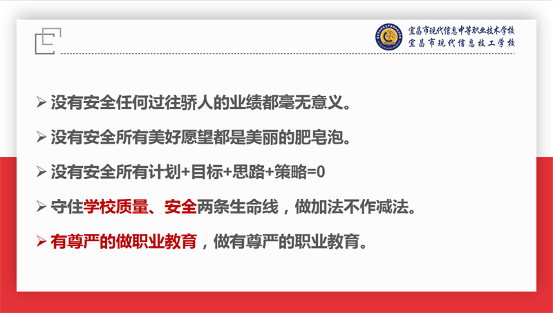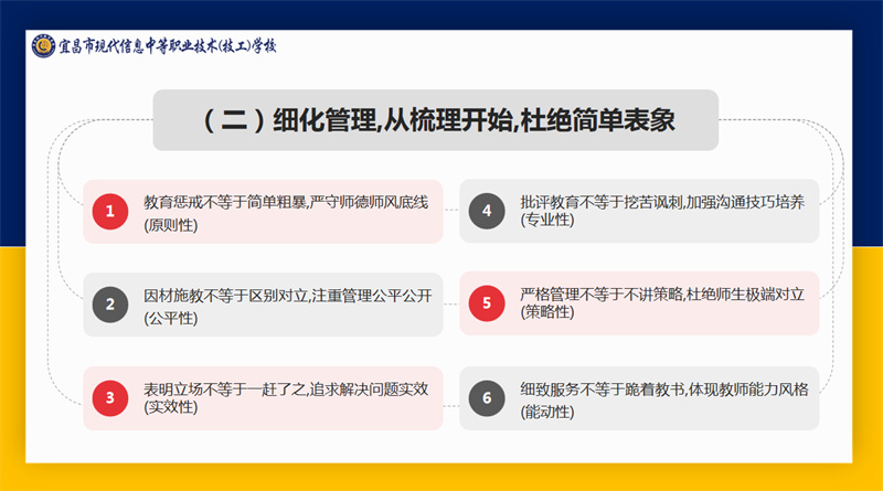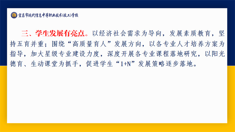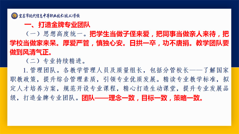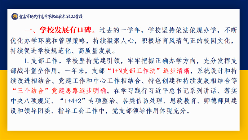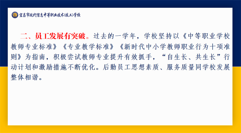 宜昌市职业技术教育研究室主任周欣带来以“教育强国建设背景下宜昌中职教育高质量发展的实践探索”为主题的专题讲座。他围绕“教育强国,职教何为”“职业教育的特点和规律”“宜昌职业教育发展举措”“宜昌市中职教育教学工作”“现代信息学校教学工作情况”“关于现代信息学校相关建议”六个维度进行详细讲解。本次讲座不仅为教职工提供了深入了解职业教育政策和职业教育发展的专业窗口,更为全体现代人办好职业教育凝聚了共识、增强了信心、坚定了决心。