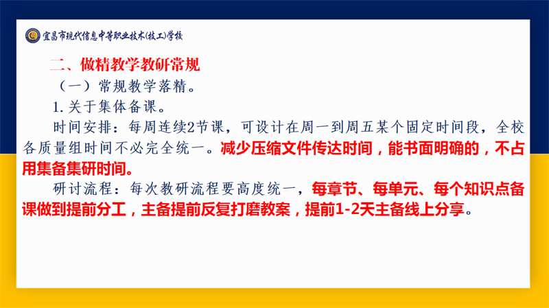 聚焦质量生命线,夯实教学主阵地。吴昌钧为新学年的教学工作制定了“打造金牌专业团队”“做精教研教学常规”“全面提高育人质量”三项总体要求。他在工作计划中强调:强化一个中心,坚定不移提升教学质量;抓好两支队伍,全力赋能教师与学生;深化三项研究,为教学发展注入动能;办好师生赛事,落实多项教育教学活动。同时,他也提出了管理团队的三个“一致”、教师育人的“十字”准则,集备集研的“六步走”等具体细则。