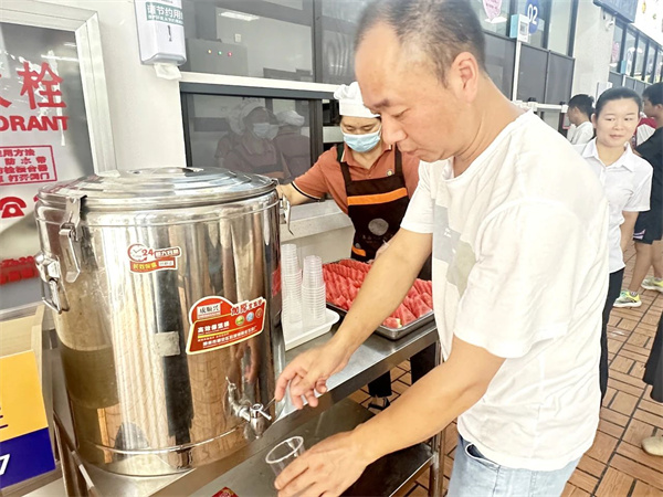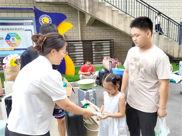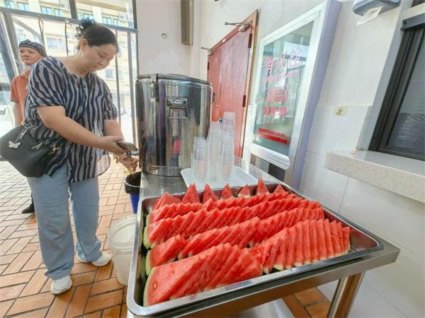 人文关怀藏于点滴细节,冰镇西瓜夹杂些许凉意,大桶橙汁滋味甘甜,雪糕的丝丝甜意缓解了炎炎夏意,藿香正气水摆放在各个工作点。车辆组工作人员早上七点等候在宜昌东站,为有需要的家庭提供接站服务。
