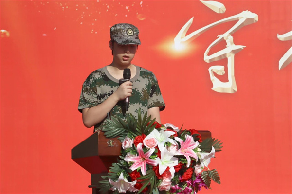 新生代表2507班赵文渤同学发言,表示将以最饱满的姿态迎接高中生活的第一场“成长考验”,郑重宣誓“一切行动听指挥,以军人的标准严格要求自己”“磨练顽强意志,传承优良作风”“巩固军训成果,展现青春风采”。