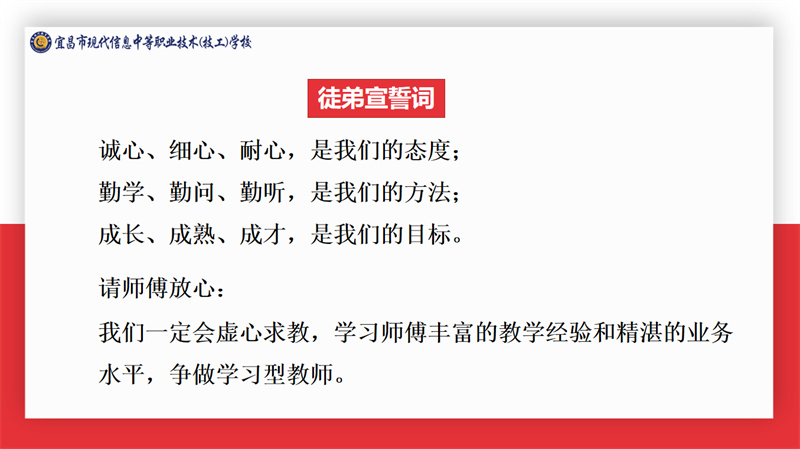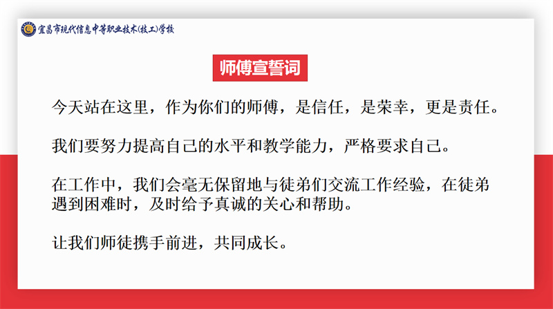 “作为你们的师傅,是信任,是荣幸,更是责任……”“我们一定会虚心求教,学习师傅丰富的教学经验……”在领誓人的带领下,师徒双方举起右拳,庄严宣誓。铿锵有力的誓言在会场回荡,每一句承诺都饱含着师傅的责任担当与徒弟的求学渴望。这份郑重的承诺,将化作日后教学相长的实际行动,见证着师徒共同成长的美好历程。
