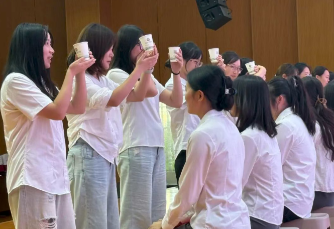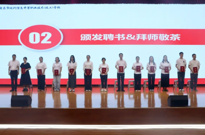在悠扬的乐声中,党支部副书记、校长吴昌钧为各位指导教师颁发了鲜红的聘书。这份聘书,不仅是一份荣誉,更是一份沉甸甸的责任。随后进行的拜师敬茶环节将仪式推向高潮:青年教师们双手捧杯,躬身敬茶,以传统礼仪表达对师傅的崇高敬意;指导教师们含笑接茶,轻抿回礼,用温暖的目光传递着师者的期许。一盏清茶,清香四溢,承载着尊师重道的优良传统,更象征着教育薪火的代代相传。
