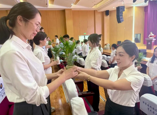 徒弟向师傅敬献了精心挑选的绿植作为拜师礼。一盆盆绿意盎然的植物,既象征着教育事业的生机与活力,也寓意着师徒情谊的长青不凋。徒弟教师将以绿植为喻,在师傅的悉心指导下扎根成长,蓄力绽放;师傅教师也将如园丁般精心栽培,用心呵护,让每一株"幼苗"都能茁壮成长,最终桃李成荫。