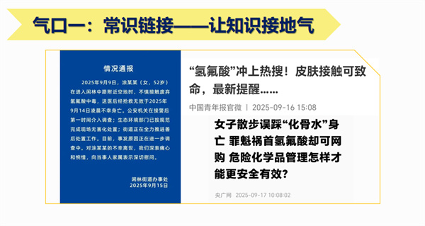 一是结合社会热点,讲授与学科相关的常识性内容。比如一条新闻报道有人不小心踩到了建筑工地遗留的垃圾,里面有氢氟酸,这个人经过大量的治疗之后仍然死亡。我就从氢氟酸的特性入手,讲解氢氟酸通过什么机制腐蚀骨髓,中间发生了怎样的离子交换,以至于有了“化骨水”的俗称,以及一些相关的急救措施。再比如刚发生的卢浮宫失窃案,本是一两句话就可以总结的事件,但我们能从中延伸出历史、政治等相关知识。我们的学生,平时接触不到手机,能接触手机时又沉浸在他们自己的小世界,所以他们对社会和生活的认知非常匮乏,而教师作为生活经验比他们要富足的成年人,可以从生活的方方面面教导他们,这些也是教育的一部分。