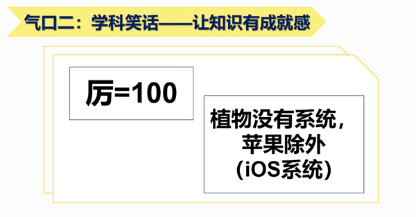 二是适时引入学科相关的幽默元素。总有学生说:“这个学科学了有什么用呢?以后根本用不上。”这时就适合用一两个学科小笑话来应对这种情况,让他们切身体会到:如果不学习的话,连笑话都听不懂,在别人笑的时候,只能尴尬的附和,后悔自己当时没有好好学。这些笑话只涉及学科最简单的内容,但能让学生有“学以致趣”的成就感。