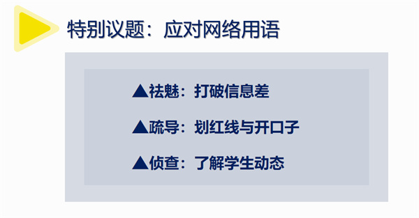 现在的学生普遍存在频繁使用网络用语的现象。一不留神,就从学生口中蹦出一两个非常不合时宜的网络用语。一部分学生使用网络用语是想营造只有学生知道彼此在说什么,而老师不知道的隐秘的优越感。另一部分学生只是鹦鹉学舌,却不知道这个网络用语的背后隐藏的恶意。遇到这种情况,我的应对策略是:第一,主动了解并适当使用部分网络用语,消解群体优越感;第二,限制使用恶劣的网络用语,包容一些中性的网络用语,将其用成课堂氛围的调节剂。此外,通过观察学生网络用语的新旧程度,还能分析学生课外接触电子产品的情况。