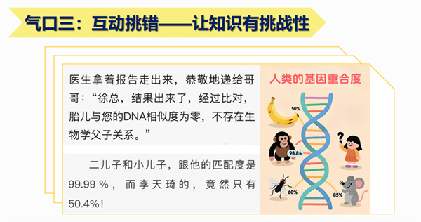 三是设计互动性挑错环节,需要学生对知识有一定的掌握。例如有一些没有生物常识的小说会写,检测两人DNA发现相似度为0%或50%,面对这种描写,让学生自己尝试运用所学知识对错误进行辨析和修正。