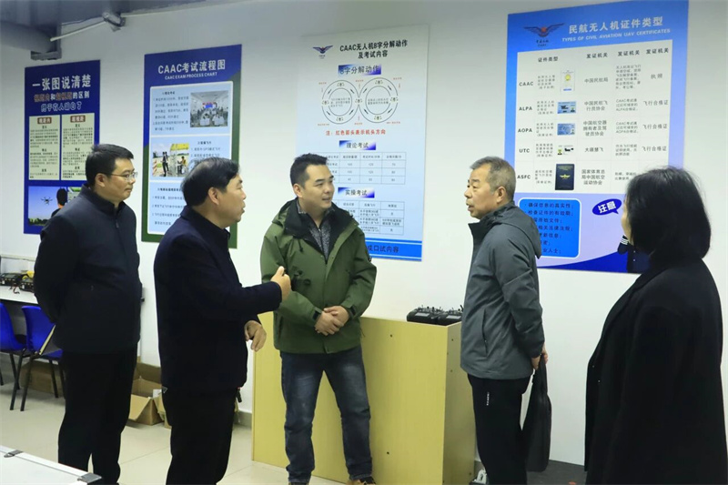 调研组一行在学校领导的陪同下,实地考察了校企合作中心、无人机实训室、心理咨询室、报告厅、游泳馆、学生寝室等场所,细致了解了学校在学生实习实训、生活居住环境和校园安全管理等方面的具体举措。