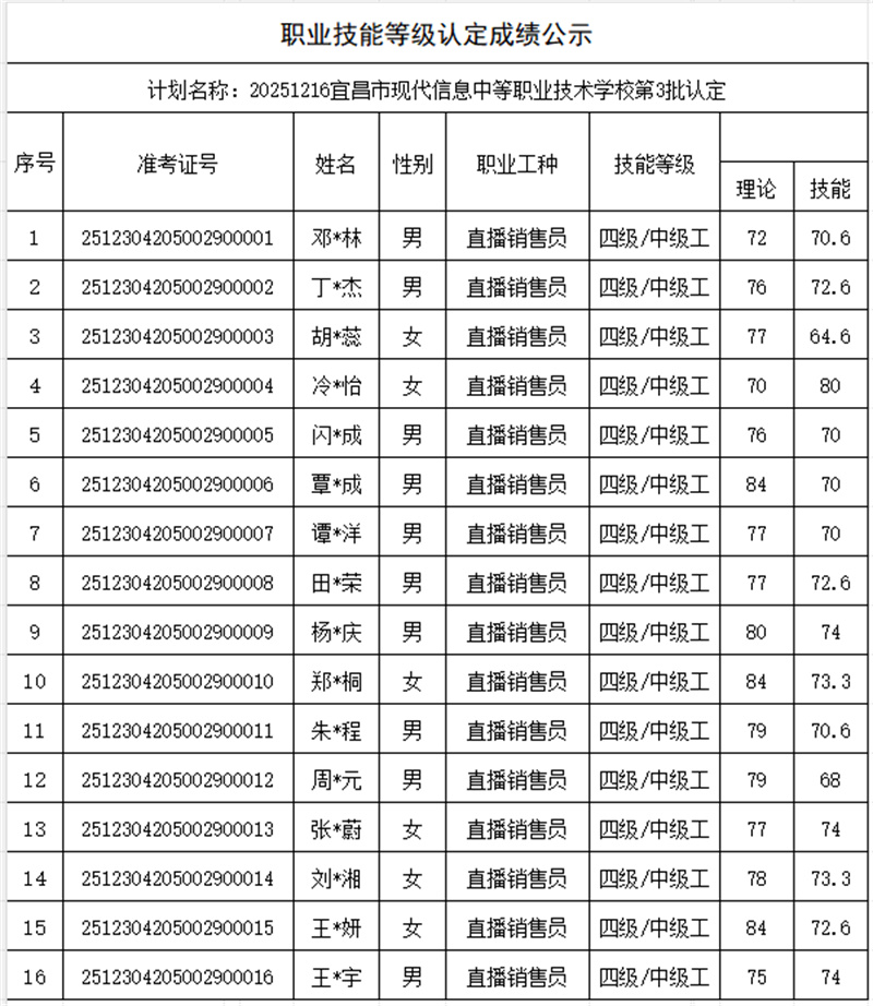 【成绩公示】宜昌市现代信息学校2025年第2-3批职业技能等级认定成绩公示